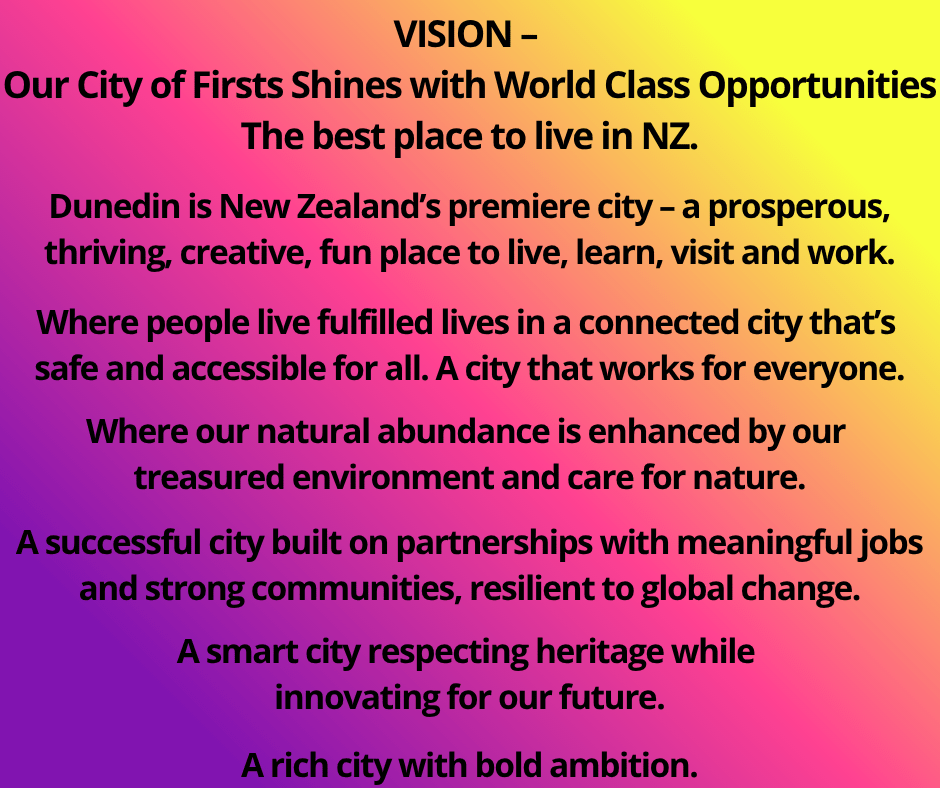 - Create Bold, Unified Dunedin Vision – Ambitions that inspire everyone to action. Work together to make a united vision we can all strive for. Create strategies and action plans to make things happen. Make us the best place to live in NZ.